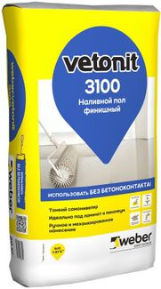 Вебер.Ветонит 3100 - сухая смесь предназначена для финишного выравнивания пола, для оснований с пониженной прочностью. Подходит под паркет, ламинат, линолеум, для заделки трещин до 20 мм, для системы «Теплый пол», для бетонных, цементно-песчаных оснований. Ручное и механизированное нанесение. Для жилых, общественных, офисных помещений с умеренными нагрузками. Для внутренних работ в сухих и влажных помещениях.