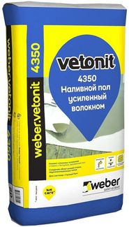 Вебер.Ветонит 4350 - сухая смесь на основе цемента и специальных добавок предназначена для выравнивания полов в жилых, общественных, офисных помещениях. Используется при ремонте и в новом строительстве по бетонным, цементно-песчаным, слабым и сложным основаниям. Подходит для системы "Теплый пол". Для ручного и механизированного нанесения. Для внутренних работ в сухих и влажных помещениях..