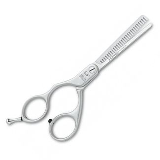 Модель имеет маленький вес и стильный дизайн благодаря ручкам, изготовленным из алюминия. Оснащены одной филировочной кромкой с 28 зубцами, позволяющими создавать объём, структуру и плавные незаметные переходы в стрижке. Съёмный упор для мизинца и регулируемый винт натяжения полотен позволяют использовать эти ножницы для всех типов волос. Особенности:
