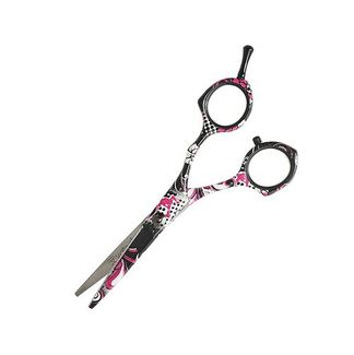 размер ножниц: 5 дюймов / 12.7 см ножницы эргономичной формы высококачественная нержавеющая сталь чёрное кобальтовое покрытие с узором ножницы для стрижки с тонкими кончиками классическая заточка режущих полотен (для всех техник стрижки) винтовая группа с системой mini-click стопор-амортизатор со встроенным металлическим винтом съёмный упор для мизинца