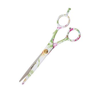размер ножниц: 6 дюймов / 15.2 см ножницы эргономичной формы высококачественная нержавеющая сталь чёрное кобальтовое покрытие с узором ножницы для стрижки с тонкими кончиками классическая заточка режущих полотен (для всех техник стрижки) винтовая группа с системой mini-click стопор-амортизатор со встроенным металлическим винтом съёмный упор для мизинца