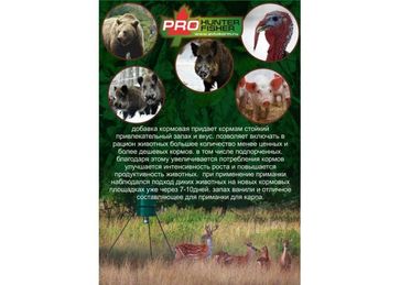 Добавка кормовая придает придает кормам стойкий привлекательный запах и вкус. Позволяет включать в рацион животных большее количество менее и более дешевых кормов, в том числе подпорченных. При применении приманки наблюдается подход диких животных на новых кормовых площадках уже через 7-10 дней. None