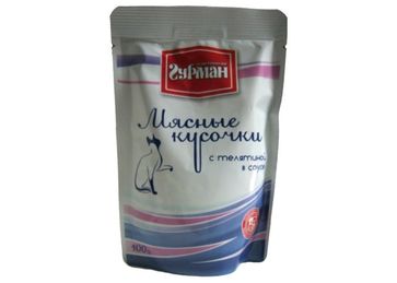 - Четвероногий гурман Мясные кусочки в соусе для кошек с Телятиной (Паучи) по выгодной цене 350 р. руб.;