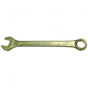 Ключ изготовлен из углеродистой стали. Твердость материала рабочей части ключа 42 HRC (требования ГОСТ – 41–46 HRC). Покрытие – желтый цинк. Профиль кольцевого зева имеет 12 граней, что увеличивает площадь соприкосновения рабочих поверхностей и снижает риск деформации граней крепежа при монтаже. Угол наклона кольцевого зева относительно плоскости ключа в 15 градусов делает монтаж более удобным. Ключ гаечный комбинированный с открытым и кольцевым зевом предназначен для монтажа (демонтажа) резьбовых соединений. None