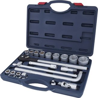торцевые головки на 3/4: 19 - 21 - 22 - 24 - 27 - 30 - 32 - 36 - 38 - 41 - 46 - 50 мм трещотка 3/4" на 500 мм удлинитель 3/4" на 100, 200 мм вороток Т-образный 3/4" на 450 мм вороток L-образный 3/4" карданный шарнир 3/4" адаптор 3/4"(F)*1/2"(M) & 3/4"(F)*1"(M) пластиковый кейс None