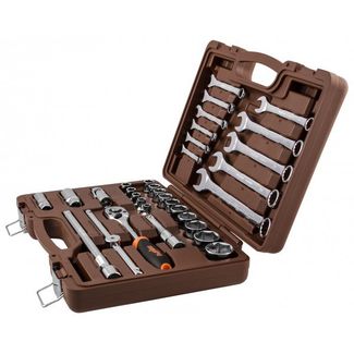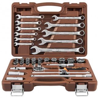 Головки торцевые 1/2DR, 15 шт.: 8, 9, 10, 11, 12, 13, 15, 17, 18, 19, 22, 24, 27, 30, 32 мм; Рукоятка трещоточная 1/2"DR, 72 зубца; Шарнир карданный 1/2"DR; Удлинитель 1/2"DR, 125 мм; Удлинитель 1/2"DR, 250 мм; Головка торцевая свечная 1/2"DR, 16 мм; Головка торцевая свечная 1/2"DR, 21 мм; Вороток Т-образный 1/2"DR, 250 мм; Ключи гаечные комбинированные, 11 шт.: 8, 9, 10, 11, 12, 13, 14, 17, 18, 19, 22 мм; Пластиковый кейс. Безналичный расчет. Необходима предоплата Возможен самовывоз. Есть доставка.