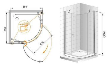 Монтаж: пристенный в угол Возможная установка: на поддон, на пол Высота: 1950 мм Форма: четверть круга Ориентация: универсальная Радиус: 550 мм Конструкция двери: распашная Исполнение полотна двери: прозрачное (C) Количество секций двери: 1 Толщина полотна двери: 6 мм Цвет профиля: хром Материал полотна двери: закаленное стекло, стандарт EN12150-1:2000 Материал профиля: анодированный алюминий, стандарт DIN17611 2007 Регулировка ширины: предусмотрена за счет боковых профилей Крепления полотна двери: цилиндрическая петля с подъемным механизмом Дополнительная информация: поддон приобретается отдельно Ресурс эксплуатации: 15 лет Гарантия: 3 года с даты продажи, за исключением резинотехнических изделий -на резинотенические изделия (силиконовые уплотнители, магнитные уплотнители, ) 1 год с даты продажи None