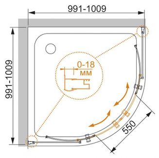 Монтаж: пристенный в угол Возможная установка: на поддон, на пол Высота: 1850 мм Форма: четверть круга Ориентация: универсальная Радиус: 550 мм Конструкция двери: раздвижная Исполнение полотна двери: прозрачное (C), рифленое PUNTO (P) Количество секций двери: 2 Толщина полотна двери: 5 мм Цвет профиля: хром Материал полотна двери: закаленное стекло, стандарт EN12150-1:2000 Материал профиля: анодированный алюминий, стандарт DIN17611 2007 Регулировка ширины: предусмотрена за счет боковых профилей Крепления полотна двери: двойные подшипниковые ролики Дополнительная информация: поддон приобретается отдельно Ресурс эксплуатации: 15 лет Гарантия: 3 года с даты продажи, за исключением резинотехнических изделий -на резинотенические изделия (силиконовые уплотнители, магнитные уплотнители, ) 1 год с даты продажи None