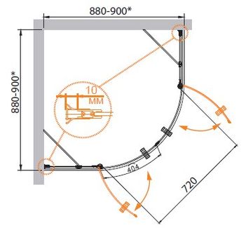 Монтаж: пристенный в угол Возможная установка: на поддон, на пол Высота: 1950 мм Форма: четверть круга Ориентация: универсальная Радиус: 550 мм Конструкция двери: распашная Исполнение полотна двери: прозрачное с матовым рисунком (CP),прозрачое стекло (C) Количество секций двери: 2 Толщина полотна двери: 6 мм Цвет профиля: хром (Сr), бронза (Br), золото (G) Материал полотна двери: закаленное стекло, стандарт EN12150-1:2000 Материал профиля: анодированный алюминий, стандарт DIN17611 2007 Регулировка ширины: предусмотрена за счет боковых профилей Крепления полотна двери: цилиндрическая петля без подъёмного механизма Дополнительная информация: поддон приобретается отдельно Ресурс эксплуатации: 15 лет Гарантия: 3 года с даты продажи, за исключением резинотехнических изделий -на резинотенические изделия (силиконовые уплотнители, магнитные уплотнители, ) 1 год с даты продажи None