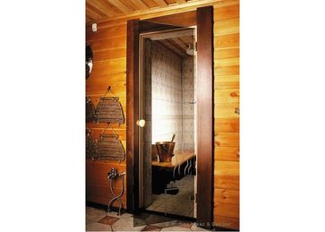 Двери для саун Andres (Эстония) Двери для саун производятся из закаленного стекла толщиной 8 мм. которое в 5 раз прочнее обычного стекла и, учитывая пожелания клиентов, коробка двери сделана из клееной осины без сучков. Коробка не коробится при колебания температуры, а также не выделяет древесную смолу