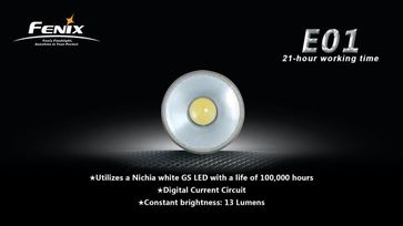 Фонарь Fenix E01 один из самых компактных фонарей-брелков. Как и все фонари бренда Fenix, Е01 водонепроницаемый, противоударный фонарик с высшей степени анодирования. Включение происходит путём поворота головной части. 1 режим яркости мощностью 10 люмен, при котором фонарь работает около 21 часа. Цифровая регулировка выхода - поддерживает постоянную яркость. Защита от обратной полярности, защита от неправильной установки батарей. None