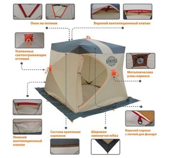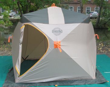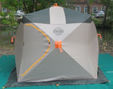 Палатка для рыбалки Омуль Куб 1 от Митек подходит для комфортной зимней рыбалки.Надежность-Быстросборный карскас из дюралевого прутка диаметром 8мм. Все соединительные узлы металлические.-Тент из ткани с водоотталкивающей пропиткой Oxford 210T 1000PU, выдерживает 1000мм водяного столба.-Надежная фурнитура. Крупная молния с двухсторонними замками.-Тент пошит прочными армированными нитками двойным швом.Комфорт-Большой внутренний объем.-Гармонично подобранная расцветка тента создает максимальный уют.-Палатка укомплектована съемными карманами, имеет патентованную систему креплений, которая позволяет распологать их в любом удобном месте.-Для создания дополнительного утепления в тенте предусмотрена возможность крепления быстросъемного внутреннего тента имеющего аналогичную систему крепления карманов, позволяющую перевешивать их внутрь внутреннего тента.-Петля-кольцо под куполом для подвешивания фонаря.-Регулируемые по ширине вентиляционные окна: вентиляционное окно под куполом для выхода угарного газа, для тех, кто пользуется плитками и обогревателем; нижняя вентиляция для обеспечения конвекции воздуха. Все вентиляционные окна снабжены защитными клапанами.-Обзорное окно закрывающееся изнутри шторкой на молнии.Практичность-Светлая ткань на стенках палатки и световая вставка на крыше обеспечивает отличное освещение внутри в снегопад и в пасмурную погоду.-Светоотражающие элементы на крепежных петлях-оттяжках издали видны в свете фар снегоходов и автомобилей даже при отсутствии внутренней подсветки.-Четыре прочные петли оттяжки на стенках палатки и восемь петель на юбке позволяют надежно закрепить палатку на льду.-Широкая замкнутая юбка полностью исключает поддув холодного воздуха снаружи. None