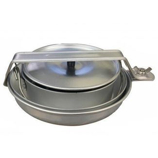 Набор посуды из 4 предметов подходит для туристического похода и кемпинга.Набор очень компактен и прост в использовании. Благодаря разъемной ручке элементы набора удобно складываются один в один.Полноценная ручка с фиксатором позволяет удобно держать посуду при готовке и употреблении пищи.Материал посуды отличается прочностью и долговечностью.В комплекте:Сковорода с разъемной ручкой: диаметр - 17.5 см., высота - 3 см.Миска глубокая с плоским дном: диаметр - 16.5 см., высота - 3 см.Котелок с крышкой и ручкой для подвеса: диаметр - 13.5 см., высота - 4,2 см.Кружка, пластик: 240 мл.Общий вес набора: 225 гр. None