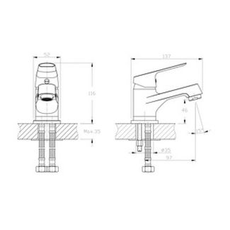 • Картридж D-35 (RSH102) с керамическими пластинами • Высота смесителя - 116 мм. • Излив литой, неповоротный, 97 мм. • Высота излива (до аэратора) - 46 мм. • Пластиковый аэратор с нержавеющим корпусом • Угол наклона аэратора - 15 гр. • Универсальная присоединительная группа (шпилька - 2шт). • Гибкая подводка с латунными гайками 35см. -2 шт. • Металлическая ручка