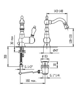 Управление: рычажное Материал: латунь Исполнение: хром, бронза, золото 24 карат Длина излива: 14,3 см Высота излива: 12,8-13,3 см Механизм: керамический картридж Отверстия для монтажа: 1 отверстие Тип подводки: гибкая 1/2" Оснащение: донный клапан, аэратор Рабочий интервал давления в водопроводной сети: 0,5-6,0 Атм Гарантия: 5 лет с даты продажи (за исключением резиновых уплотнителей, шлангов, переключателей)