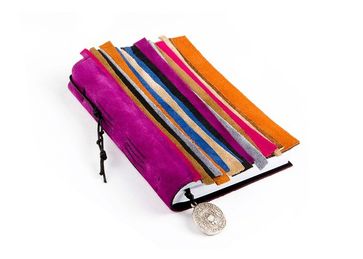 "полосатый" ежедневник, весь как видно разноцветный, на черном велюровом подкладе. все натуральная кожа. внутри - линованный, не датированный блок, 320 страниц. размер ежедневника 11,5*15,5 см.