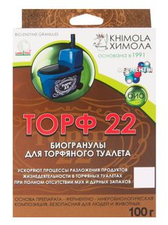 Биогранулы для торфяного туалета «Торф-22» — экологически чистая смесь ферментов и микроорганизмов. Способствует устранению зловонных запахов разлагающейся органики, ускоряет естественные биологические процессы переработки и минерализации продуктов жизнедеятельности.