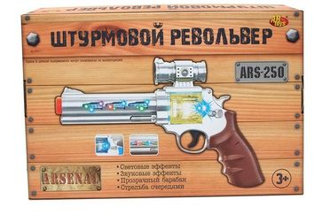 Электромеханический штурмовой револьвер от бренда Arsenal - стильное оружие с прозрачным барабаном. Такая игрушка не оставит равнодушным ни одного мальчика. Револьвер имеет различные световые и звуковые эффекты, оригинальный прозрачный барабан, через который видны пули и функцию стрельбы очередями. Минимальная сумма заказа 1500 руб. Возможен самовывоз. Есть доставка.
