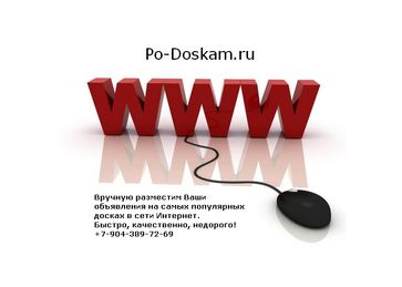 Предоставляем услуги по ручному размещению Ваших объявлений на самых популярных досках Российского Интернета. Интересуют как разовые заказы, так и долгосрочное сотрудничество. Так же, работаем по отдельным регионам и тематическим доскам. Быстро, качественно, недорого.