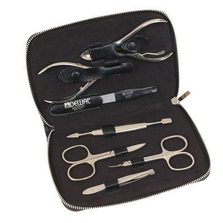 Чехлы к наборам Dewal сделаны из натуральной кожи. Bсе маникюрные инструменты изготавливаются из высоколегированной и нержавеющей стали Solingen 1.4021 на лучших производствах и прошли надлежащий контроль качества на каждом этапе производства. Маникюрный набор Dewal 501BL включает: