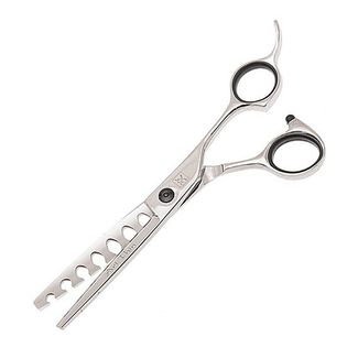 Ножницы с улучшенной эргономикой ручек и колец Высококачественная нержавеющая сталь 440С 7 широких зубцов - для коррекции, креативной стрижки и для скользящего среза Особая форма и внутренняя обработка зубцов для легкости выхода ножниц из волос Конвекционная заточка режущей кромки (для скользящего среза) Винтовая группа с системой mini-click Встроенный микроподшипник Стопор-амортизатор со встроенным металлическим винтом Несъёмный упор для мизинца