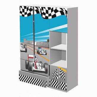 Бренд - Кровати-машины (Россия), Серия - Гонка, Ширина, мм - 1250, Высота, мм - 1800, Выступ, мм - 500, Компоненты, входящие в комплект - стеллаж комбинированный:2 дверцы, 3 полки;шкаф платяной:1 штанга для вешалок, 2 дверцы, 2 ящика, 3 полки, Стиль - модерн, Размеры, мм - 1250х500х1800, Материал фасада - ЛДСП Е1, Материал корпуса - ЛДСП Е1, Страна производителя - Россия, Объем упаковки, куб. м - 0.25, Цвет фасада - голубой с цветным рисунком, Цвет корпуса - белый, Гарантия, месяцы - 18 Работаем круглосуточно!Возврат 21 день. Страна производства: Россия Есть доставка.