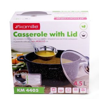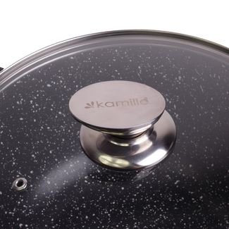 Кастрюля с антиприагрным покрытием "черный мрамор" Kamille — эксклюзивное предложение нашего интернет-магазина. Благодаря прочному антипригарному покрытию, такой сотейник устойчив к механическим воздействиям, за счет чего значительно увеличивается срок его службы. Кастрюля нагревается равномерно, не создавая перегретых участков и холодных краев, даже в тех случаях, когда процесс приготовления еды идет на небольшом огне. В результате сокращается время приготовления блюда и уменьшается риск есть смесь недожаренной или пережаренной пищи. Уже после первого использования кастрюли с антипригарным покрытием Вы будете удивляться, как могли обходится без него ранее. Материал: литой алюминий. Крышка: жаропрочное стекло. Внутренний диаметр: 24см. высота 11,5см. Антипригарное покрытие: чёрный мрамор. Тип дна: многослойное. Мерная шкала: нет. Тип ручек: литые (цельнолитые). Крышка с отверстием для выхода пара: да. Цвет: черный. Особенности: