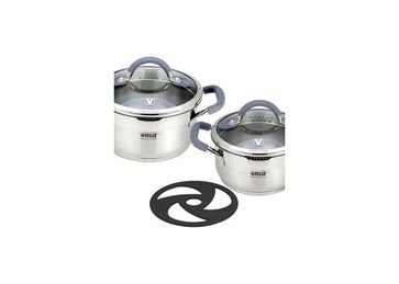 Артикул - vs_2120,Количество предметов - 5,Размер упаковки, мм - 305x225x255,Цвет - сталь,Материал - нержавеющая сталь,Тип поверхности - глянцевый, матовый,В комплекте - Кастрюля ,d200мм, 3.3л, 1 шт.,,Крышка ,1 шт.,,Кастрюля ,d180мм, 2.4л, 1 шт.,,Крышка ,1 шт.,,Подставка ,1 шт.,,,Тип нагрева - газовая, индукционная, электрическая,Дополнительные параметры - Набор посуды из 5 предметов : 20 см кастрюля с крышкой - 3, 3, 18 см кастрюля с крышкой - 2, 4, бакелитовая подставка - 1 шт, материал корпуса - нержавеющая сталь, полировка - матовая и зеркальная, дно - многослойное термоаккумулирующее, крышки из термостойкого стекла с ободком из силикона, позволяет беззвучно закрывать крышку, ручки из нержавеющей стали с силиконовым покрытием, способ крепления ручек - на клепках. None Страна производства: Франция Есть доставка. Доставка: 290.0RUR