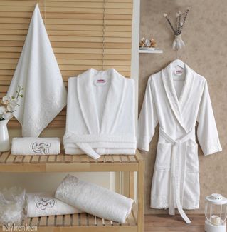 Закажите для леди: Махровый халат женский, "NELLY", размер L, кремовый, 60% Бамбук 40% Хлопок у компании Meleğim-текстиль в Россиина портале Alloy: