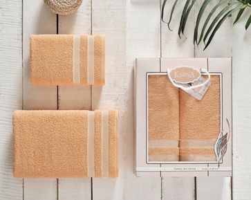 - Комплект махровых полотенец "KARNA" PETEK цвет абрикосовый 2 штуки: 50x100+70х140 см по выгодной цене 1 035 р. руб.;