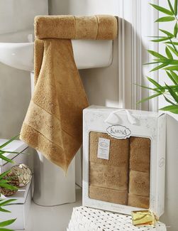 - Комплект полотенец бамбук "KARNA" PANDORA горчичный 2 штуки: 50x90+70х140 см по выгодной цене 1 755 р. руб.;