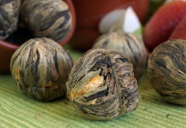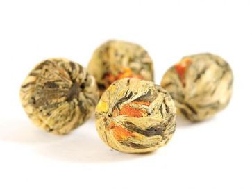 Затейливо связанные в маленькие шарики листья зеленого чая, собранного в провинции Хунань, позволяют сделать вечерние посиделки настоящим представлением. В чашке шарики распускаются как бутоны сказочного цветка, насыщая за считанные секунда напиток не только неповторимым сливочно-яблочным ароматом, но и солнечно-желтым оттенком. Чем сильнее заварка, тем явственнее чувствуется привкус ананаса и карамели. Цветки календулы придают напитку одновременной свежести и терпкости, жасмин – нежности и изысканности. Нормализует работу нервной, иммунной системы, благотворно влияет на сердечно-сосудистую и дыхательную. Позволяет забыть о раздражении, бессоннице. Одновременно дает отдохнуть обессиленному от болей различного характера. Цветки календулы устраняют инфекционные воспалительные процессы, жасмин помогает бороться с заболеваниями мочеполовой системы, восстанавливает либидо, утоляет жажду и спасает от похмелья
