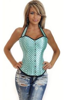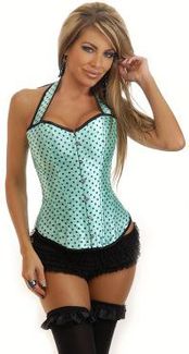 Корсет цвета морской волны в черный горошек на бретель-петле вокруг шеи. Украшен черной окантовкой. Спереди на крючке-застежке, сзади - на шнуровке. В наличии S 1 шт, M 2 шт, XL 1 шт None Есть доставка.