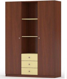 Шкаф 3-х секционный орех-лимонный Фея изготовлен из ЛДСП. В нем есть отделение с 5 полками для одежды, секция с открытыми полками и ящиками и отдел с штангой для одежды и антресолью. Наличные, Visa/MasterCard, Яндекс.Деньги, WebMoney Возможен самовывоз. Есть доставка.