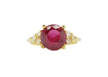 Кольцо с рубином круглой формы. Кольцо дополнительно украшено фианитами. Покрытие желтым золотом. Размеры: 16.5 мм, 17.35 мм, 18.2 мм None Есть доставка. Доставка: 200.0RUB