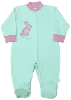 Комбинезон Веселый малыш Мятный зайка с закрытой стопой сделан из качественного хлопка, мягкого и приятного на ощупь. Он застегивается на кнопки по всей длине и ножкам, на рукавах имеются широкие манжеты, а воротничок по типу "стойка". Минимальная сумма заказа 1500 руб. Возможен самовывоз. Есть доставка.