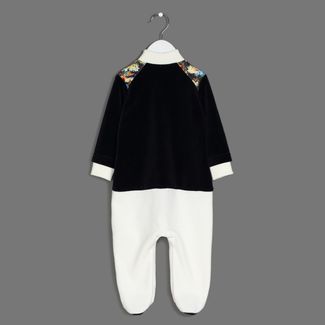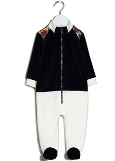Стильный велюровый комбинезон с имитацией комплекта жакета и штанишек торговой марки "Ёмаё". Комбинезон украшен принтом на плечах из оригинальной набивной ткани. Низ рукавов с манжетами, ножки контрастного цвета. Для удобства переодевания предусмотрена центральная застежка на молнию. Воротником-стойка.