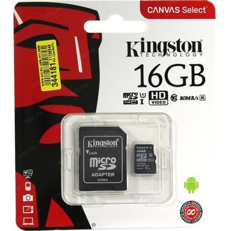 - Карта памяти microSDHC 16Gb Kingston Canvas Select Class 10, UHS-I, U1 + адаптер по выгодной цене 465 р. руб.;