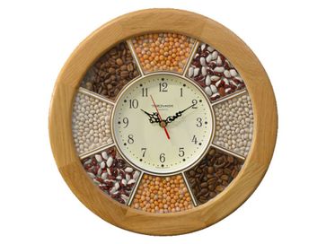 Настенные часы Ассорти займут достойное место в интерьере кухни. Модель выполнена в виде круга, поделенного на сегменты, каждый из которых наполнен определенным видом крупы, зернами кофе или специями, что привлекает взгляд и повышает аппетит. Механизм с плавным ходом точен и абсолютно бесшумен.<br>