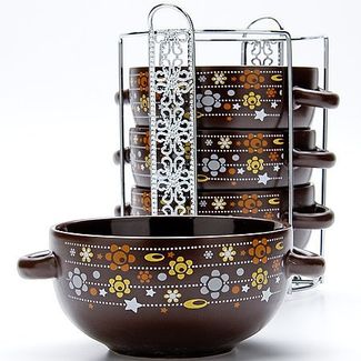 Набор из 4-х супниц LORAINE выполнен из высококачественной керамики и украшен декоративным рисунком. Супницы компактно располагаются на оригинальной подставке из нержавеющей стали и не занимают много места при хранении. В керамической посуде блюда сохраняют свои вкусовые качества, кроме того она обладает термической и химической прочностью. Благодаря оригинальному дизайну, такие супницы отлично подойдут как для ежедневного использования, так и для праздничной сервировки стола. Изделия оснащены двумя удобными ручками. В наборе: 4 супницы, 1 подставка. Подходит для мытья в посудомоечной машине. None