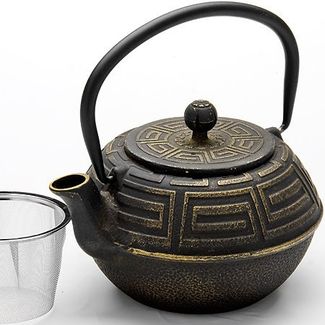 Чайник заварочный чугунный. Цвет: черный/позолота. Материал: чугун. Внутреннее/внешнее покрытие: термостойкий лак. Фильтр: нержавеющая сталь. Объем: 1500 мл. Вес: 2200 г. Размер упаковки: 18 х 18 х 11,5 см. МВ (х8). Страна производитель: Китай. Заварочный чайник изготовлен из чугуна высокого качества. Внутренняя и внешняя поверхности чайника покрыты термостойким лаком, который защищает металл от ржавчины и препятствует возникновению металлического привкуса у напитка. Размещенный внутри чайника сетчатый фильтр гарантирует прозрачность и чистоту напитка от чайных листьев. За счет равномерного распределения тепла внутри чайника, напиток получается максимально вкусным и насыщенным. Так как чугунные чайники дольше других удерживают тепло, то и вода в нем будет оставаться горячей и пригодной для заваривания чая долгое время. Этот чайник украсит любую чайную церемонию, благодаря своему стильному восточному дизайну или просто станет прекрасным подарком на торжество. Мыть без применения абразивных моющих средств. Не подходит для мытья в посудомоечной машине. Не подходит для использования на открытом огне. None