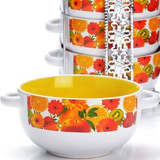 Набор супниц 5 пр LR (х6). Материал: керамика. Подставка: нержавеющая сталь. Супница: D13,5 см. Объем: 540 мл. Размер упаковки: 14,8х 14,8х 21,2 см. Упаковка: коробка. Вес 2,0 кг. Страна производитель: Китай.Набор из 4-х супниц LORAINE выполнен из высококачественной керамики и украшен декоративным рисунком. Супницы компактно располагаются на оригинальной подставке из нержавеющей стали и не занимают много места при хранении. В керамической посуде блюда сохраняют свои вкусовые качества, кроме того она обладает термической и химической прочностью. Благодаря оригинальному дизайну, такие супницы отлично подойдут как для ежедневного использования, так и для праздничной сервировки стола. Изделия оснащены двумя удобными ручками. В наборе: 4 супницы, 1 подставка. Подходит для мытья в посудомоечной машине. None