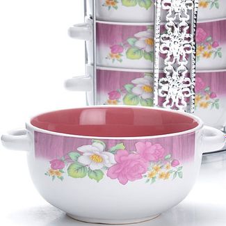 Набор супниц 5 пр LR (х6). Материал: керамика. Подставка: нержавеющая сталь. Супница: D13,5 см. Объем: 540 мл. Размер упаковки: 14,8х 14,8х 21,2 см. Упаковка: коробка. Вес 2,0 кг. Страна производитель: Китай.Набор из 4-х супниц LORAINE выполнен из высококачественной керамики и украшен декоративным рисунком. Супницы компактно располагаются на оригинальной подставке из нержавеющей стали и не занимают много места при хранении. В керамической посуде блюда сохраняют свои вкусовые качества, кроме того она обладает термической и химической прочностью. Благодаря оригинальному дизайну, такие супницы отлично подойдут как для ежедневного использования, так и для праздничной сервировки стола. Изделия оснащены двумя удобными ручками. В наборе: 4 супницы, 1 подставка. Подходит для мытья в посудомоечной машине. None