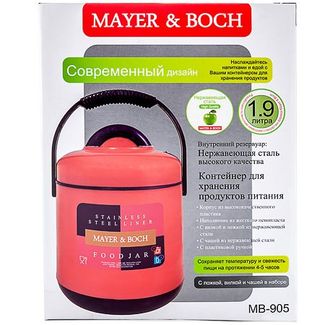 Термос в комплекте МВ(х12). Корпус, крышка: полипропилен. Цвет: коричневый,синий. Контейнер: сталь, пластик. Вилка, ложка: сталь. Внутренняя колба: сталь. Объем: 1900 мл. Размер упаковки: 18 х 17,5 х 23 см. Вес: 1215 г. Страна-изготовитель: Китай. Упаковка: коробка. Пищевой термос MAYER& BOCH станет прекрасным дополнением к набору ваших кухонных принадлежностей. Термос предназначен для длительного хранения горячих блюд, сохраняя нужную температуру до 5-ти часов. Цветной корпус выполнен из полипропилена. Внутренний резервуар и контейнер для еды - из высококачественной нержавеющей стали, не вступающей в реакцию с продуктами и не искажающей вкус приготовленных блюд. Вилка и ложка из стали. Данный термос обладает не только прекрасными термоизоляционными качествами, но и непревзойденной надежностью. Благодаря большой и эргономичной ручке его легко и удобно транспортировать. В комплекте: термос, крышка, контейнер с крышкой, 1 вилка, 1 ложка. Подходит для мытья в посудомоечной машине. None