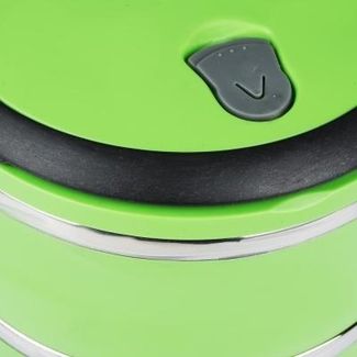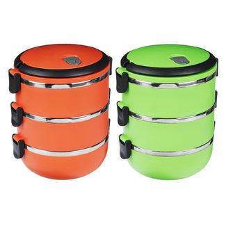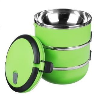 Диаметр ланч-бокса 14 см. Изготовлен из нержавеющей стали и сверху покрыт цветным пластиком. Свойства материала позволяют контейнеру в течение длительного времени сохранять необходимую температуру блюд, а герметичной крышка препятствует их протеканию.
