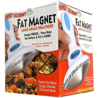 Сколько раз вы мучились, пытаясь ложкой убрать гигантские слои жира с различных супов или других блюд? Если эта картина вам знакома и вы хотите вычеркнуть её из своей жизни раз и навсегда, то magnit fat создан специально для вас! Он используется для высасывания жира из пищи, что позволяет сделать ваши блюда полезнее в разы. Предельно простой в эксплуатации, fat magnet, безусловно, может заметно облегчить приготовление пищи. «Магнит» для жира - устройство предназначено для сбора лишнего жира, который плавает на поверхности готовящегося или уже приготовленного блюда. Достаточно поместить Fat Magnet на 2,5 часа в морозильную камеру, и после извлечения оттуда гладкая выпуклая ледяная поверхность металла будет притягивать к себе жировые сгустки. После того как дно изделия полностью заполнится слоем жира, можно легко очистить его с помощью прилагающегося скребка. Скажите «Нет!» лишнему жиру в блюдах и лишним калориям! Магнит для жира Fat Magnet - удаляет жир при готовке