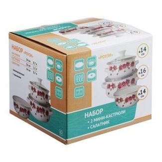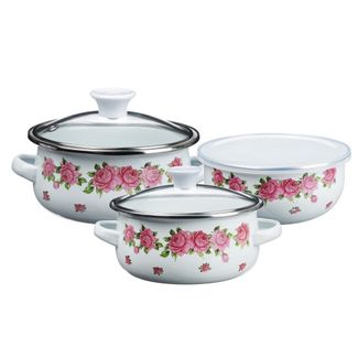 Набор эмалированных кастрюль «Роузи» включает три высококачественные емкости разного объема для приготовления мясных и овощных супов, каш и компотов. Внутреннее покрытие не вступает в реакцию с продуктами, поэтому блюда могут долго храниться, без риска окислиться или испортиться. Изделия не впитывают запахи и легко очищаются мягкой губкой. Также в комплекте есть удобный салатник, в котором удобно и подавать и хранить пищу. None Возможен самовывоз. Есть доставка.