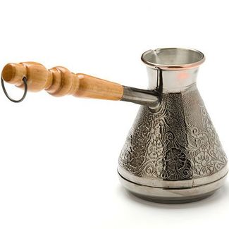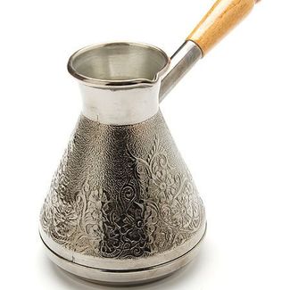 Турка (х70). Материал корпуса: медь. Внешнее покрытие: черный никель. Внутреннее покрытие: пищевое олово. Материал ручки: дерево. Объемный рисунок на внешней поверхности. Объем: 300 мл. Диаметр низа: 8,5 см. Высота борта: 10,5 см. Размер упаковки: 20 х 8,5 х 10,5 см. Вес: 167 г. Страна производитель: Россия. Турка изготовлена из высококачественной меди марки М1М, внешняя поверхность покрыта декоративным черным никелем, внутренняя поверхность – слоем пищевого олова, являющимся безопасным для здоровья. Турка предназначена для приготовления натурального кофе. Медь обладает равномерной теплопроводностью, что позволяет приготовить кофе, отличающийся изысканным ароматом. Узкое горлышко также является положительной характеристикой изделия. Длинная ручка, выполненная из дерева, обеспечивает защиту от ожогов. Подходит для использования на всех типах плит, кроме индукционных. Не подходит для использования в посудомоечной машине. Не допускается нагрев изделия без воды, а также чистка с применением металлических щеток и абразивных моющих средств. None
