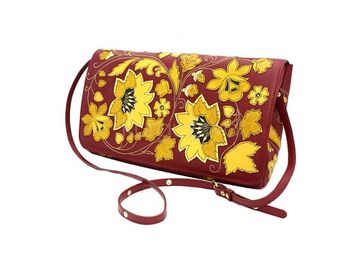 - прожилки на листочках и цветках выполнены в ручную вместительный клатч. материал: телячья кожа. цветовая гамма: красный, желтый, золотой, черный. размер: 33+18+3 см см. длинная пристегивающаяся ручка 120 см). None Есть доставка.