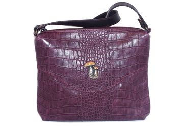 Сумка через плечо из фиолетовой кожи под рептилию. снаружи и внутри карман на молнии. сумка декорирована грибочками из латуни с чернением. размер:21х20см None Есть доставка.